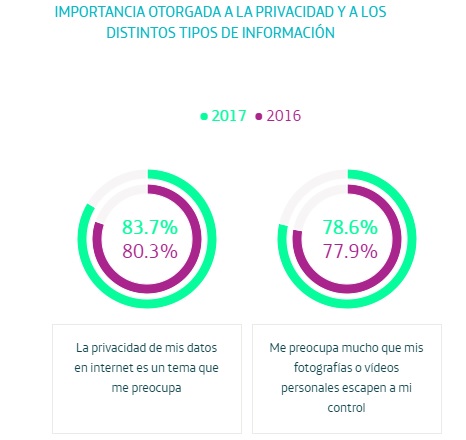 En líneas generales, el nivel de importancia que los usuarios otorgan a la privacidad de los datos es ligeramente superior en 2017. Así, al 83,7% de la población le preocupa la privacidad (de una escala de 1 a 10, la valoran con 7 o más), lo que supone 3,4 puntos porcentuales más frente al año anterior. Esta preocupación es más elevada entre las mujeres (89%) que entre los hombres (78,3%), con unas diferencias por género que se mantienen en torno a 10 puntos. Los más jóvenes, aquellos con edades comprendidas entre los catorce y diecinueve años, son los que muestran mayor sensibilidad por estos temas si los comparamos con las generaciones anteriores: casi nueve de cada diez se interesan por la privacidad.